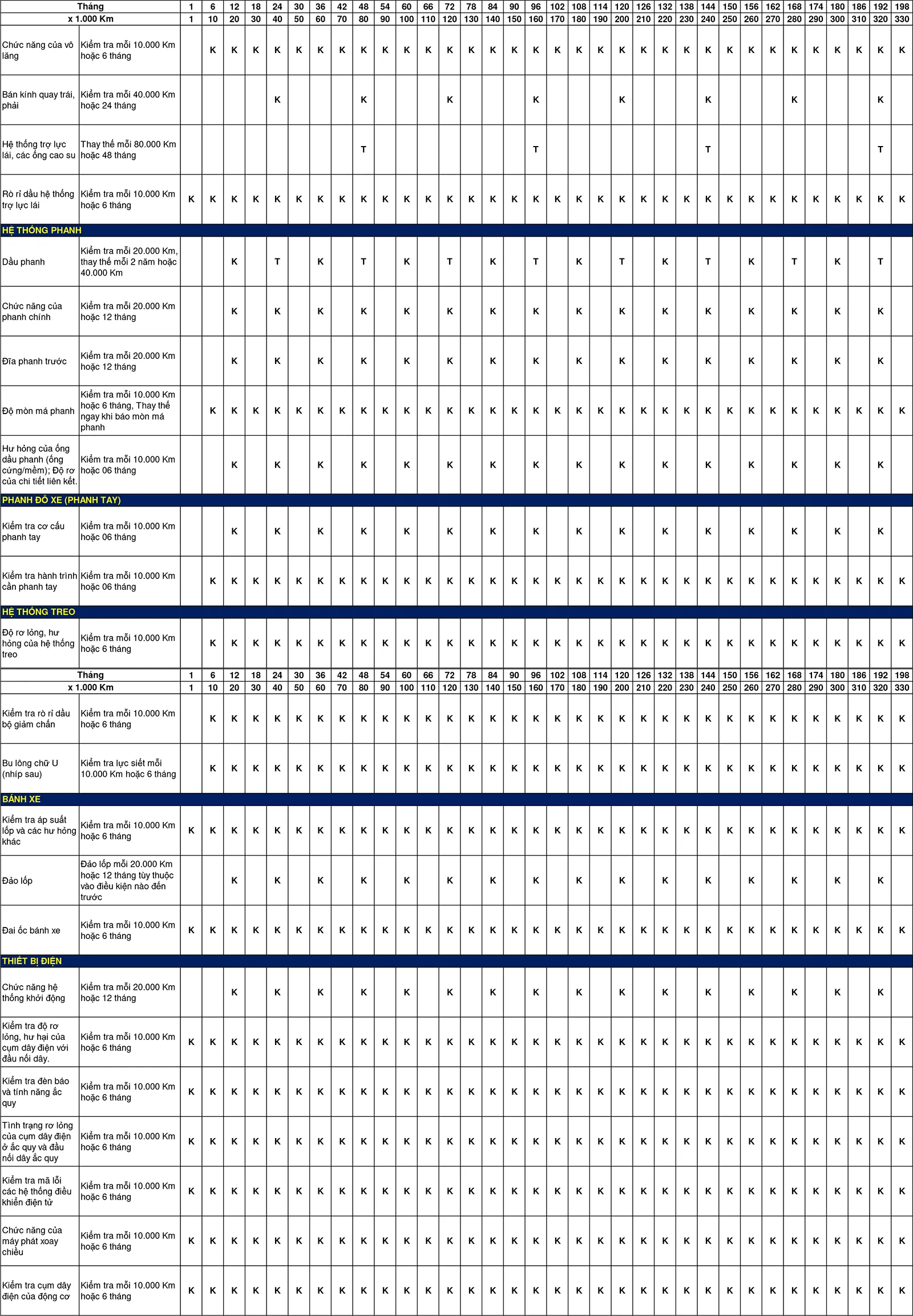 Chương trình gồm có các gói bảo dưỡng định kỳ theo thời hạn